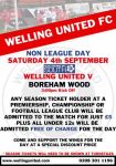 <!-- .hmmessage P { margin:0px; padding:0px } body.hmmessage { font-size: 10pt; font-family:Tahoma } -->This Saturday 4th September 2010 is Non League Day when football fans are encouraged to support their local Non League side, in the absence of any Championship or Premiership Football that weekend. Blue Sq Bet club Welling United are offering all adult Premiership,Championship and Football League Club's Season Ticket Holders to watch Welling's home game on saturday against Boreham Wood for just £5 on showing there season ticket at the turnstile. Also to encourage kids to Park View Road all under 12s will gain free entry to the game.